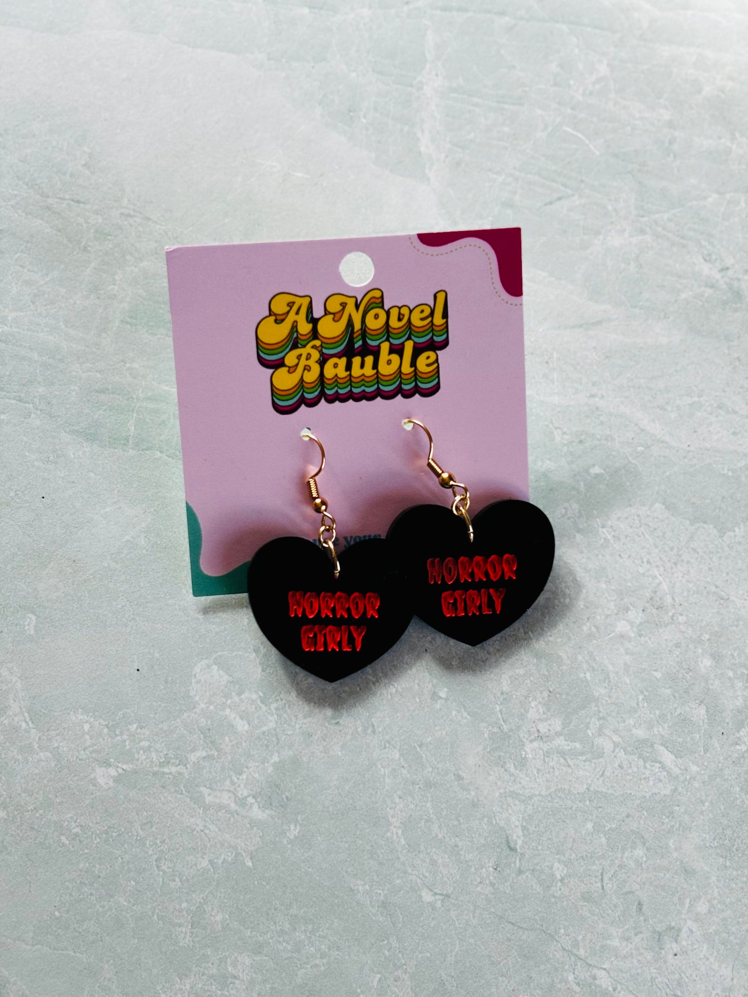 These "Horror Girly" black heart earrings are made for fans of spine-tingling tales, creepy atmospheres, and every terrifying page-turner that keeps you up at night. Featuring bold black hearts with "Horror Girly" in spooky orange font, these earrings are the perfect mix of edgy, eerie, and unapologetically bookish.