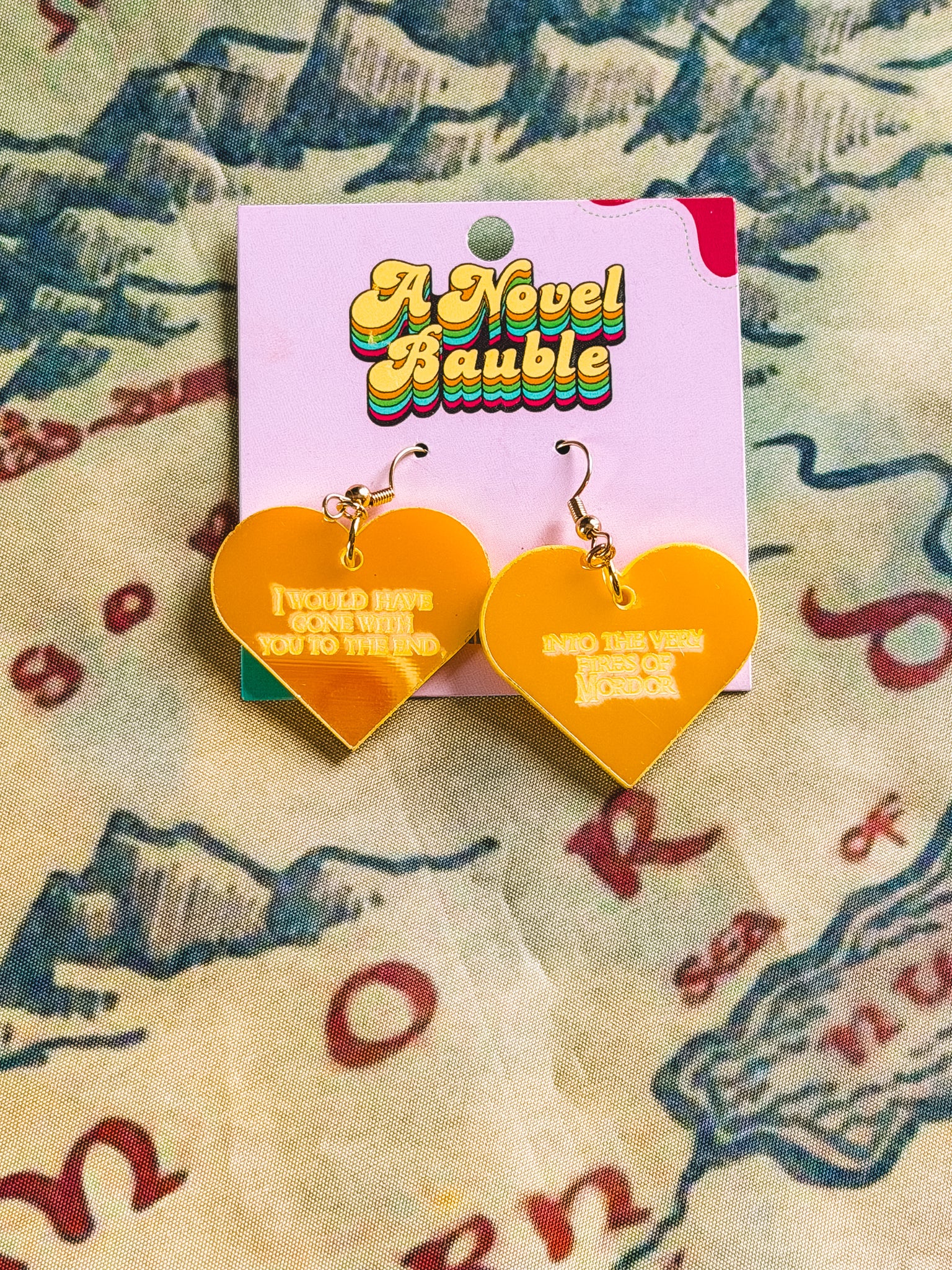 Featuring shimmering yellow iridescent hearts with engraved text celebrating unwavering friendship and devotion, these earrings are a tribute to the bonds that carry us through impossible journeys. One heart reads a promise of companionship to the very end, while the other speaks of courage in the face of overwhelming odds. Perfect for best friends, fantasy fans, and anyone who knows that true friendship is the most powerful magic of all.