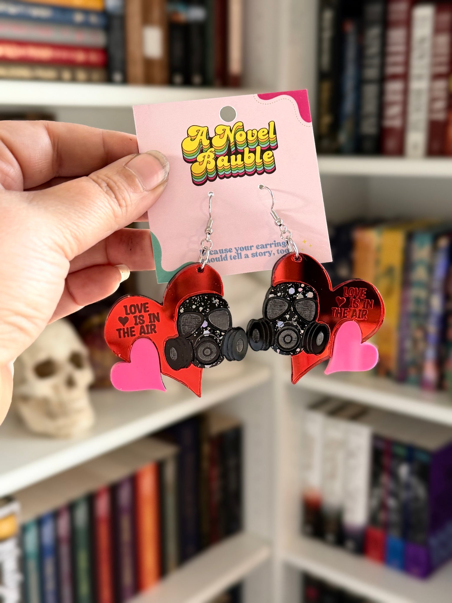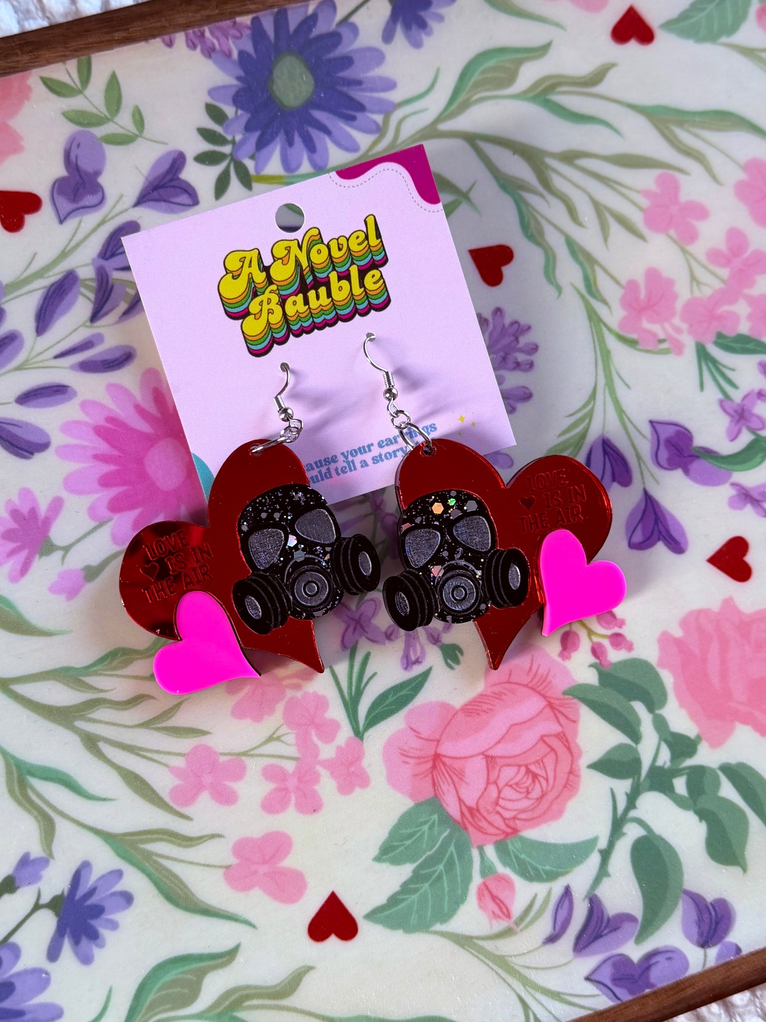These eye-catching earrings feature large red mirror hearts that say "Love is in the Air" with a twist—a hot pink heart layered on one side and a glittery gas mask on the other. Because sometimes love needs a little protection, right? The red mirror finish catches the light beautifully (check out the video to see it shine!). Made with nickel-free hooks for sensitive ears.
