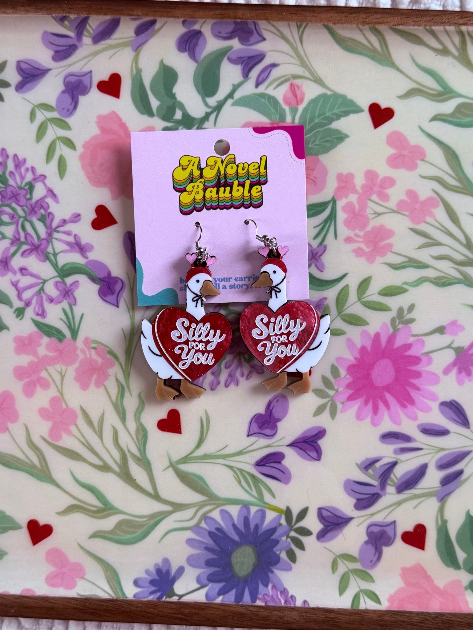 These adorable white goose earrings are holding red hearts that say "Silly for You"—because sometimes love is just plain goofy. Each goose wears a cute little red heart headband on top of their head, adding an extra dose of charm.