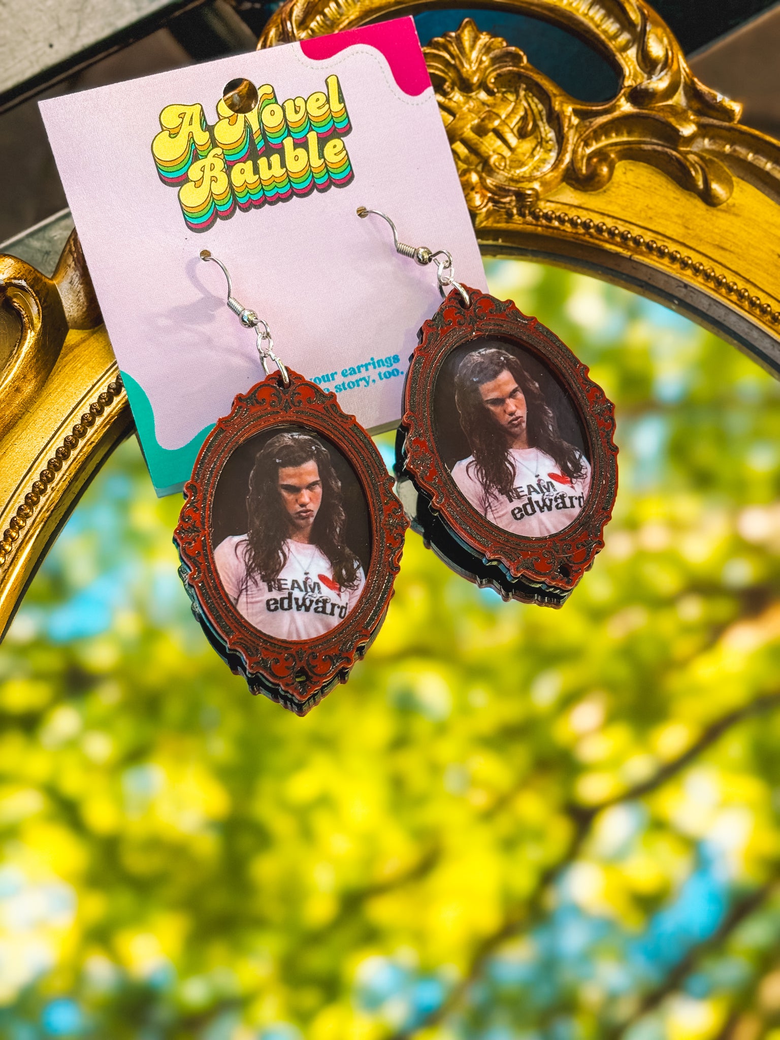 These hilarious earrings feature everyone's favorite wolf actor in disguise—rocking a wig, a skirt, and a shirt declaring allegiance to his sparkly rival. Framed in striking red with ornate black details, they're peak pop culture chaos and the perfect nod to early 2000s fandom drama. For fans who lived through the team debates and still can't stop laughing about that unforgettable sketch.