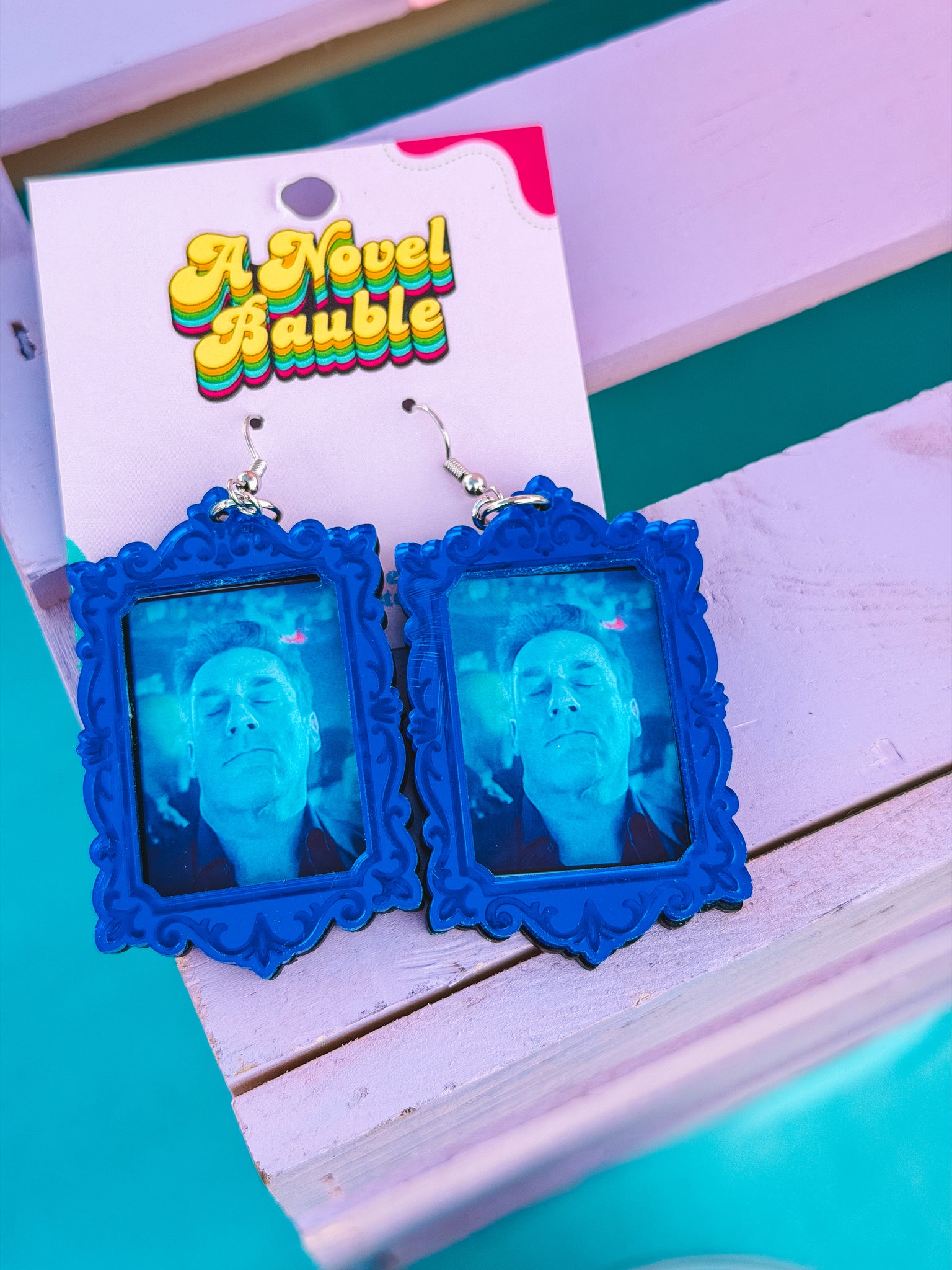 Get ready to groove with these meme-worthy earrings, featuring an ornate blue mirror frame around a legendary, dancing TV star! Perfect for anyone who loves a little humor, iconic moves, or quirky statement jewelry.